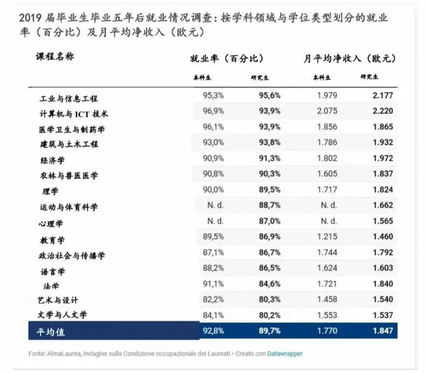 本科毕业一年后,法学毕业生月薪最高(净收入1742欧元),其次是工业与信息工程(1703欧元)、医学(1657欧元)和ICT(1653欧元)。