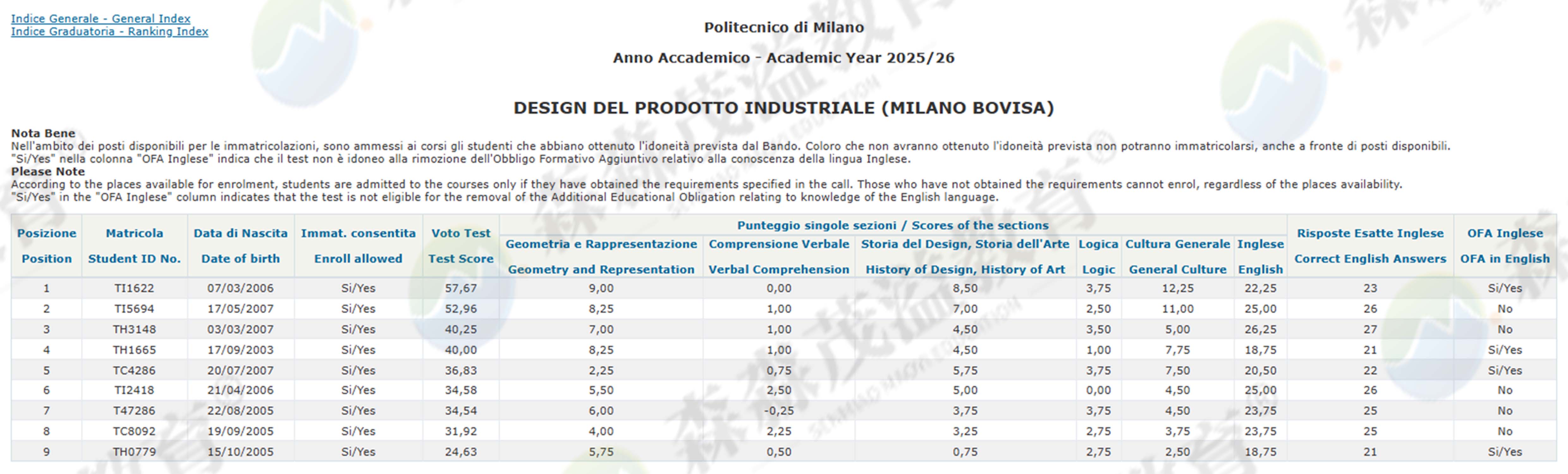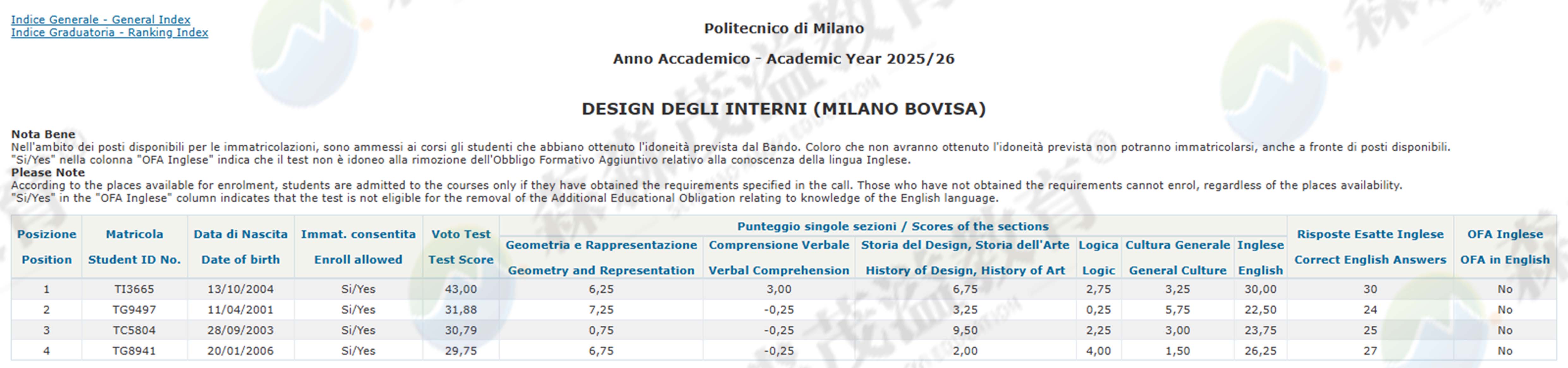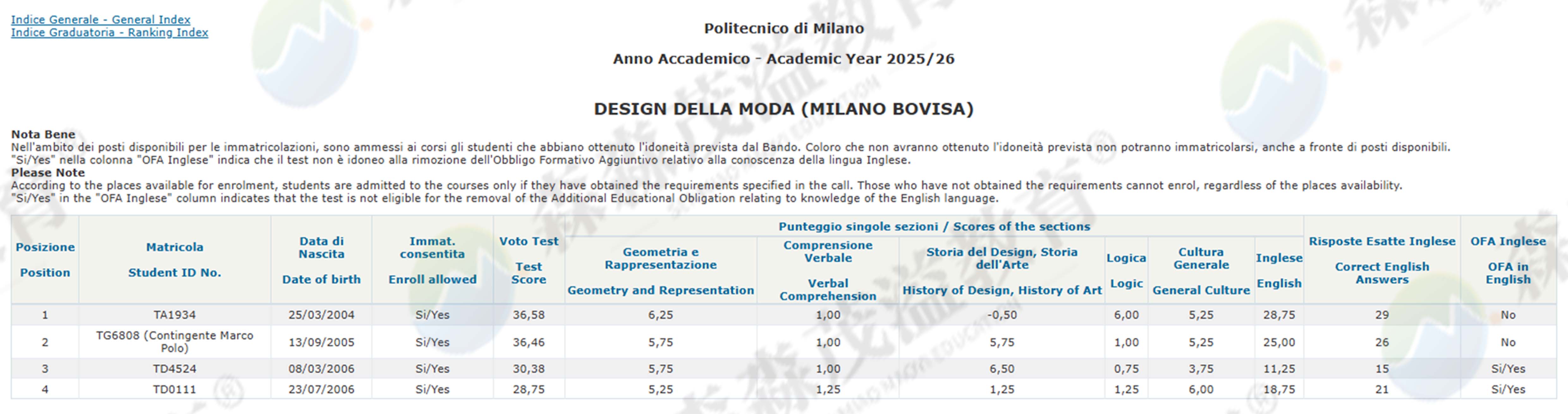 米兰理工大学2025/26学年设计类本科非欧盟生录取结果已公布。