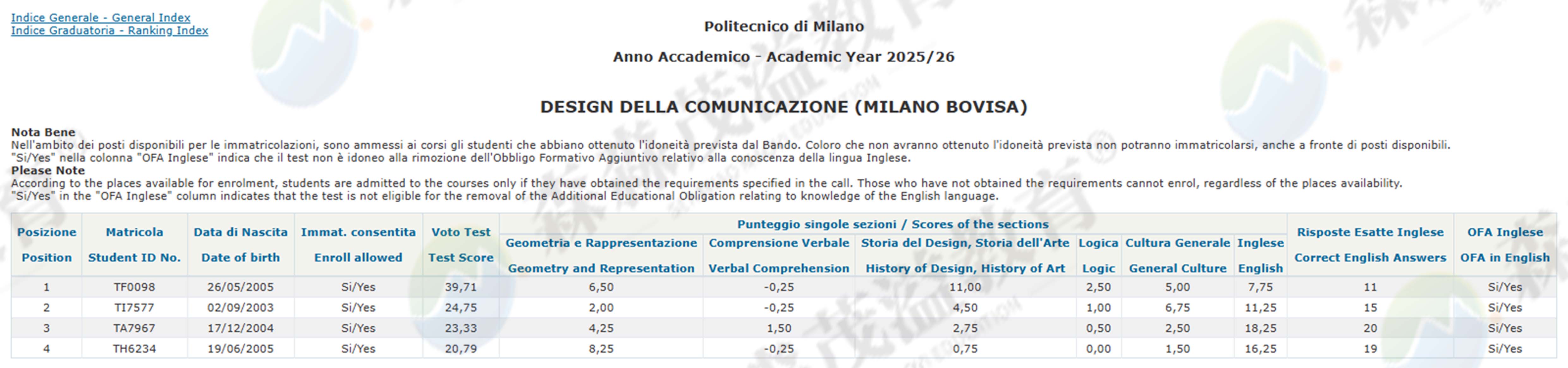 米兰理工大学2025/26学年设计类本科非欧盟生录取情况