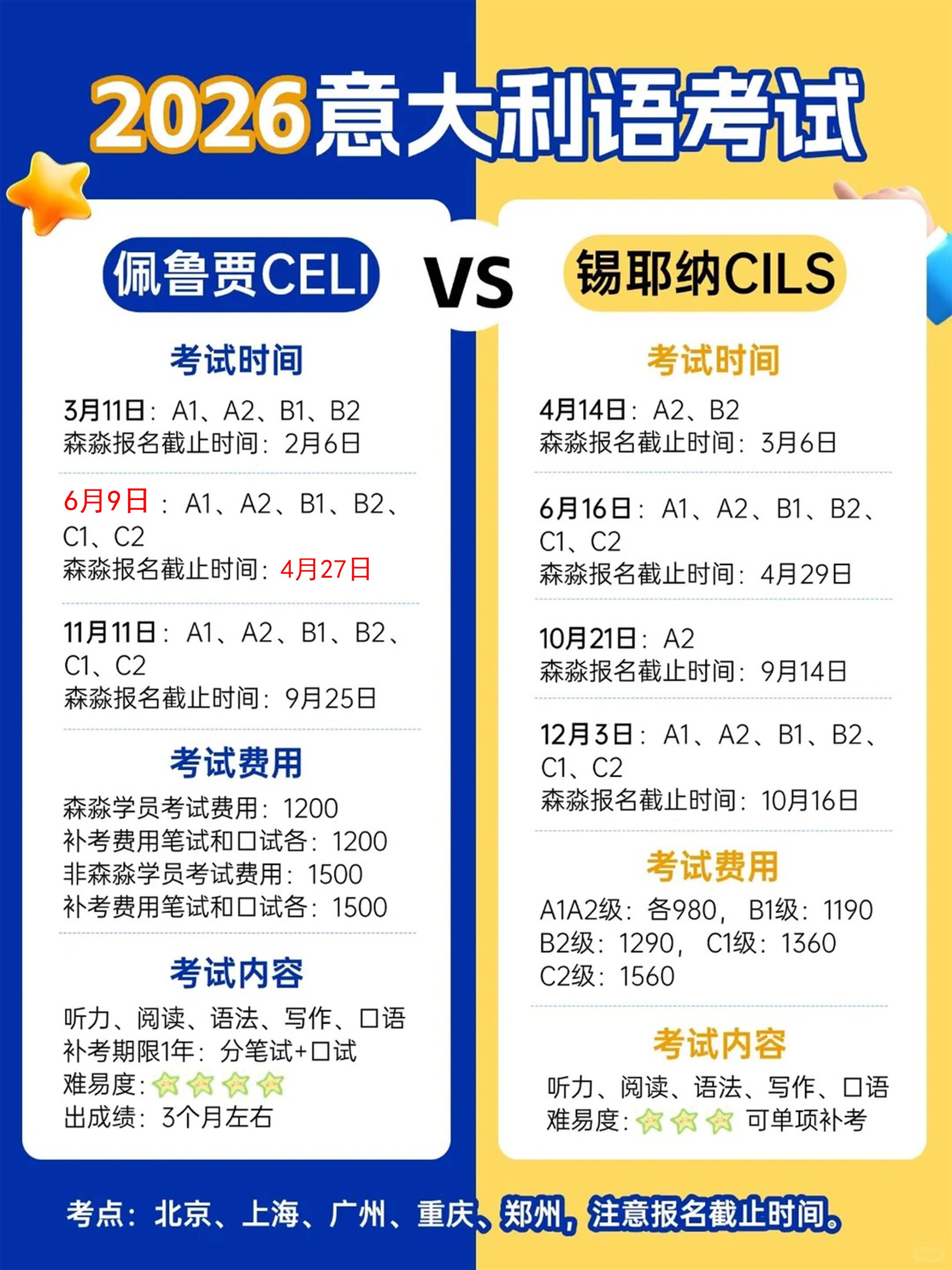 接重要通知!原定于2026年6月10日的佩鲁贾意大利语考试提前了!最新考试时间改为2026年6月9日!森淼报名截止时间提前为4月27日(原4月29日)。有计划参加此轮考试的同学不要错过报名及考试,特此提醒!