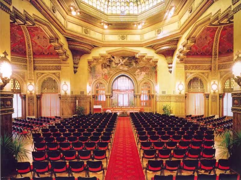 萨尔索马焦雷泰尔梅国会宫是一座具有新艺术和装饰艺术风格的大型建筑,该厅由伽利略·奇尼(Galileo Chini)于1926年设计并装饰,采用独特的装饰艺术风格,融合了阿拉伯和中国元素。宫殿富丽堂皇,充满异域风情。