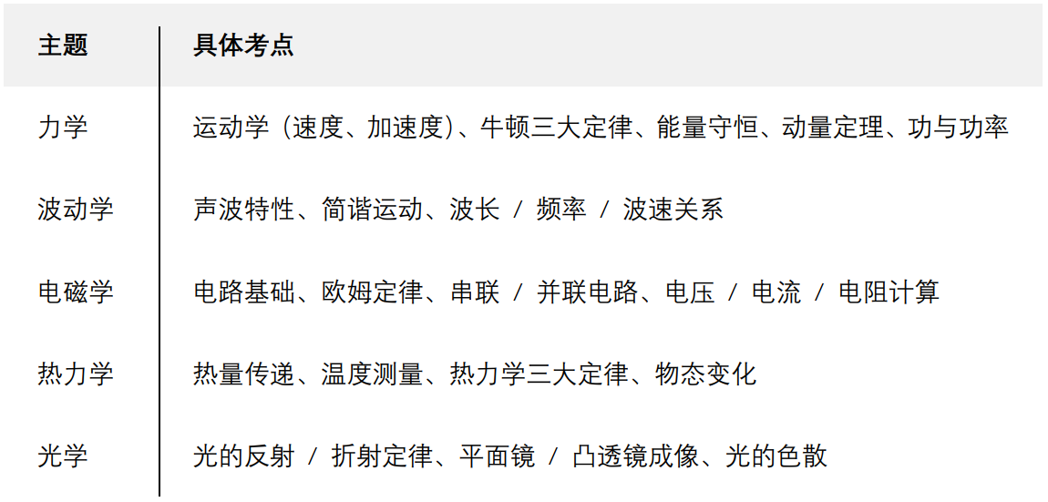 · 物理学(10分钟):5题,考察物理基本概念与问题解决能力。