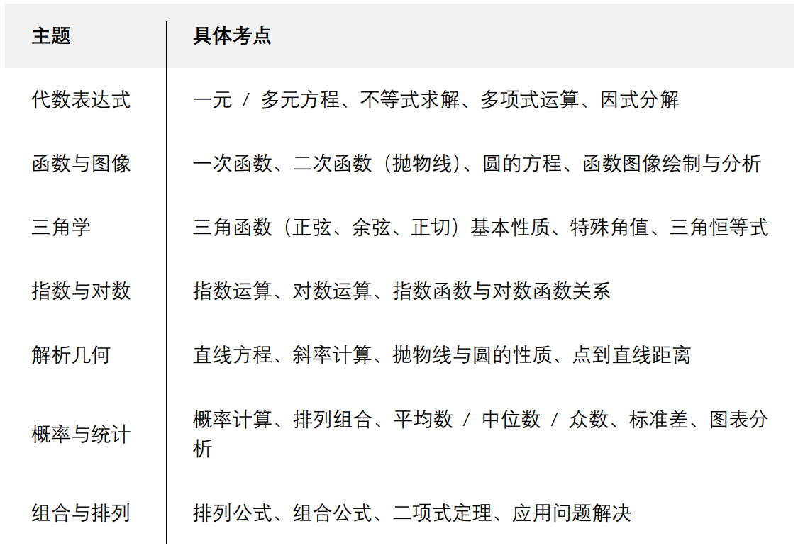 核心考查代数、几何、概率统计等基础数学能力,难度相当于高中水平。