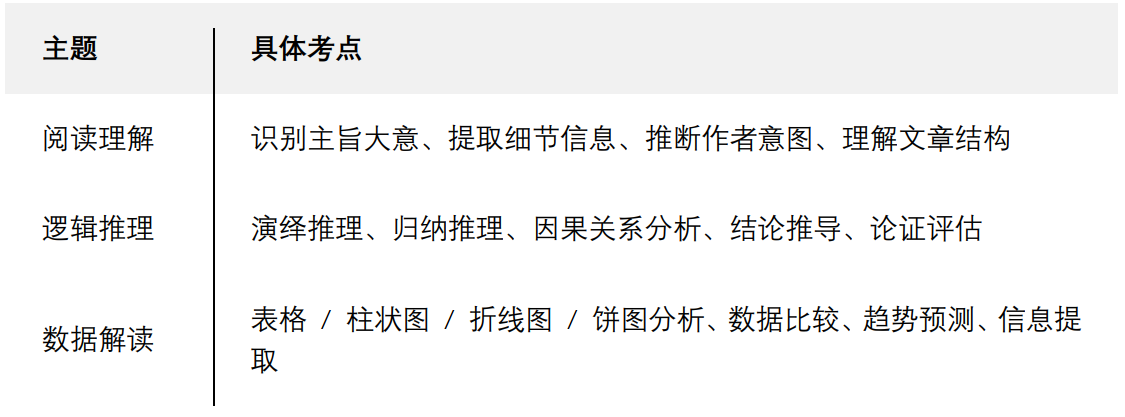 · 文本与数据推理(30分钟):15题,考察阅读理解、逻辑分析、数据解读能力。