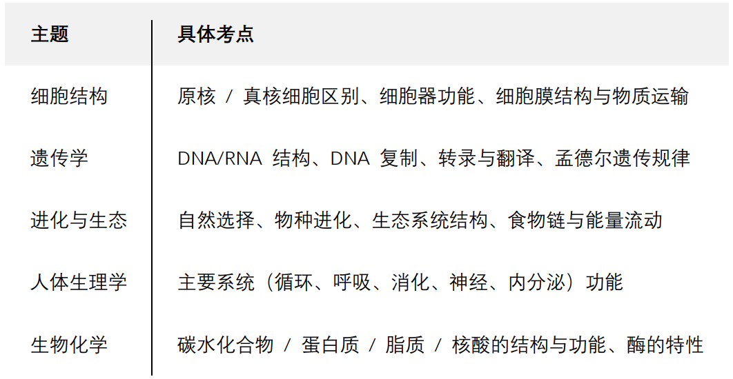 · 生物学(20分钟):10题,考察生命科学基础知识与科学素养。