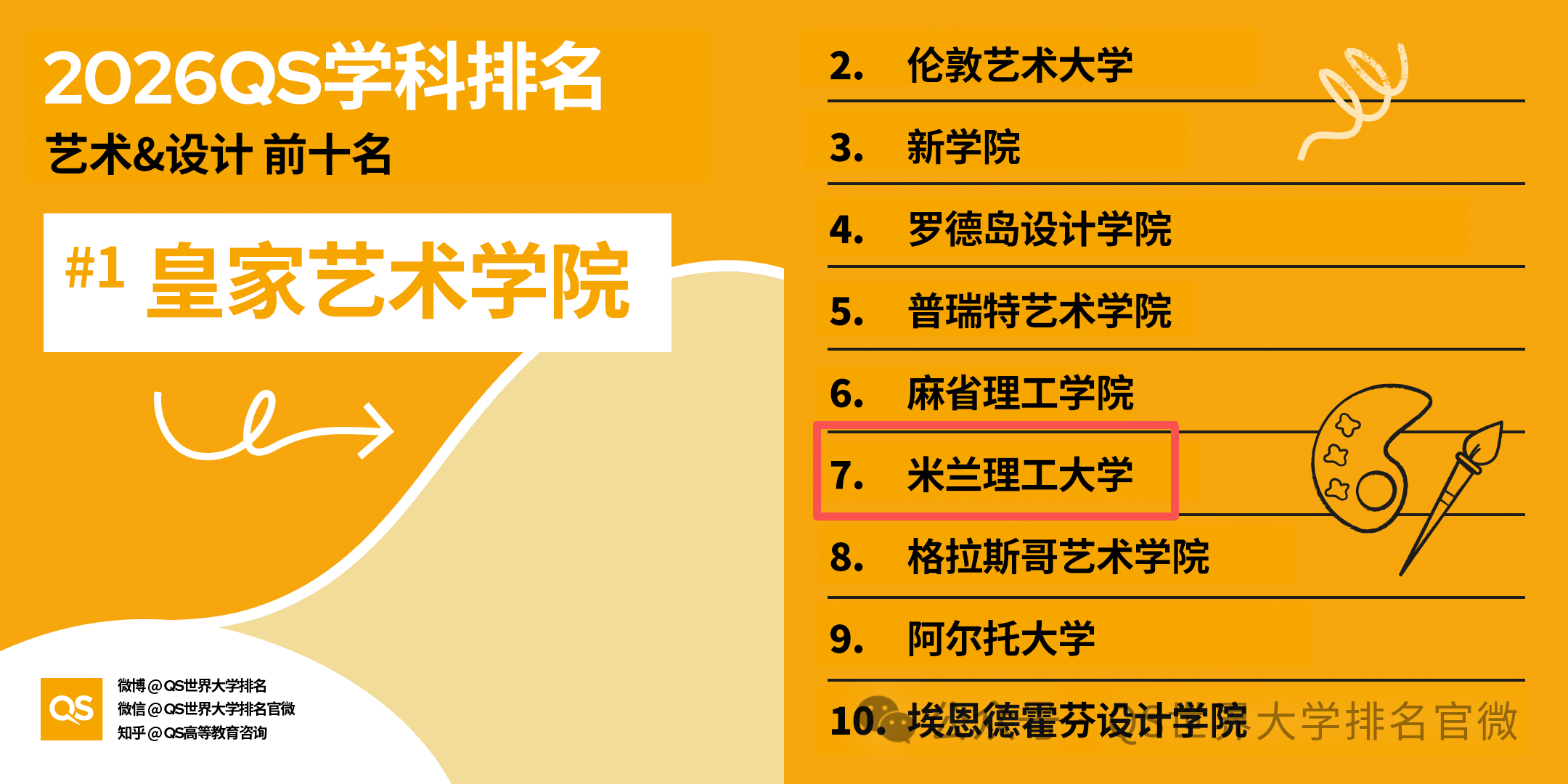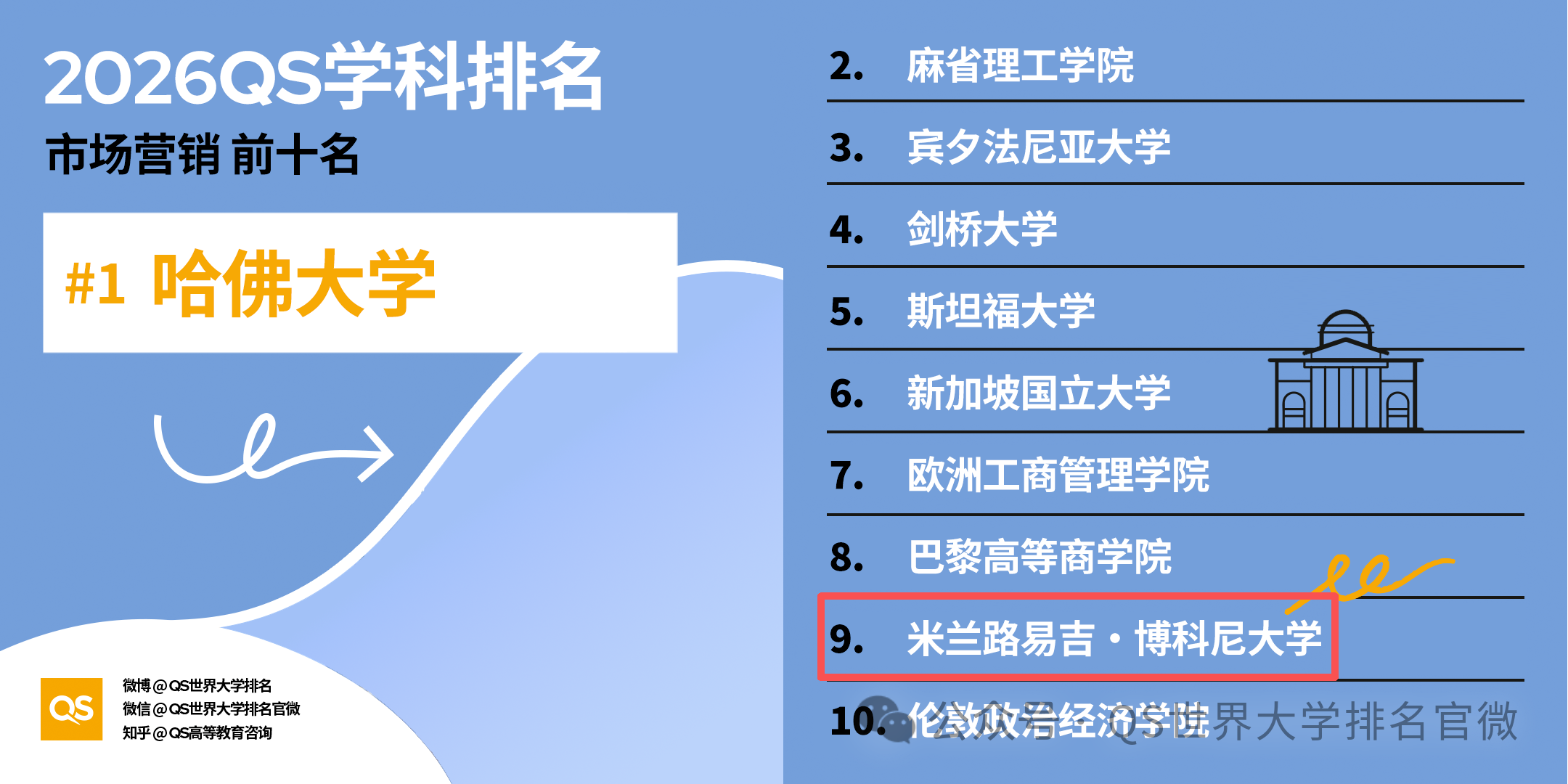 意大利共有 4 所大学的 7 个专业进入全球排名前十,分别是罗马一大、米兰理工大学、博科尼大学、比萨高等师范学校。
