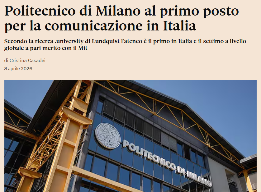 在伦德奎斯特(Lundquist)对118所意大利和国际大学进行的《.university - 2026年全球大学排名》的研究中,米兰理工大学在意大利大学中排名第一,在全球大学中排名第七,与麻省理工学院并列。