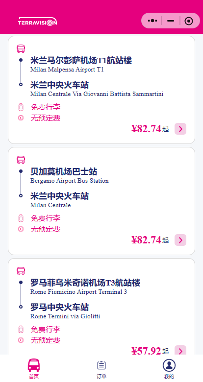 在意大利,Terravision环球大巴运营多条热门机场快线: