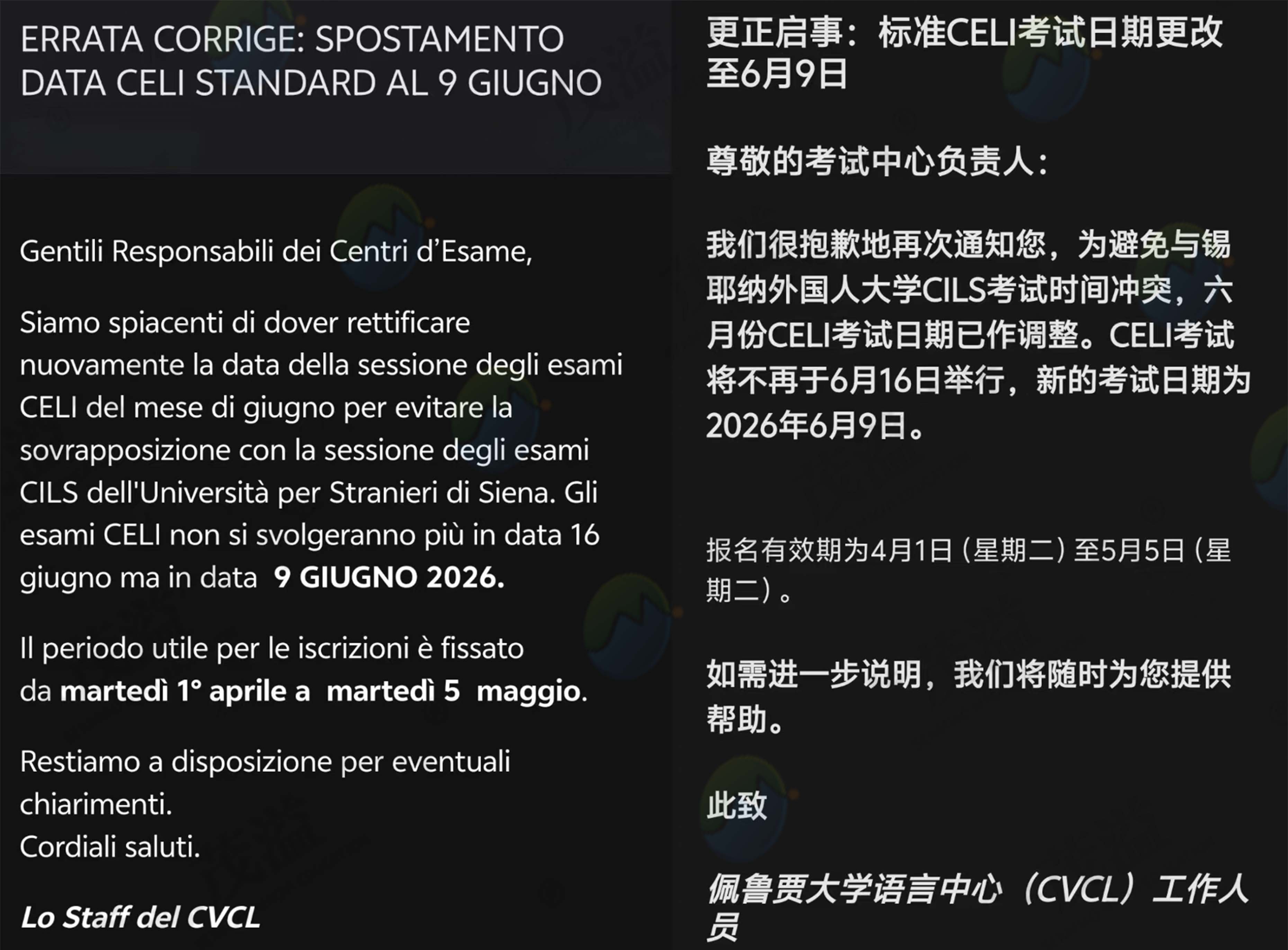 接重要通知!原定于2026年6月10日的佩鲁贾意大利语考试提前了!最新考试时间改为2026年6月9日!森淼报名截止时间提前为4月27日(原4月29日)。有计划参加此轮考试的同学不要错过报名及考试,特此提醒!