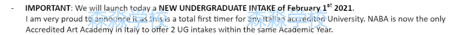 面对疫情,NABA针对本科也放开了留学通道,独家开启了本科春季入学,以帮助申请NABA学生安心无忧的留学。