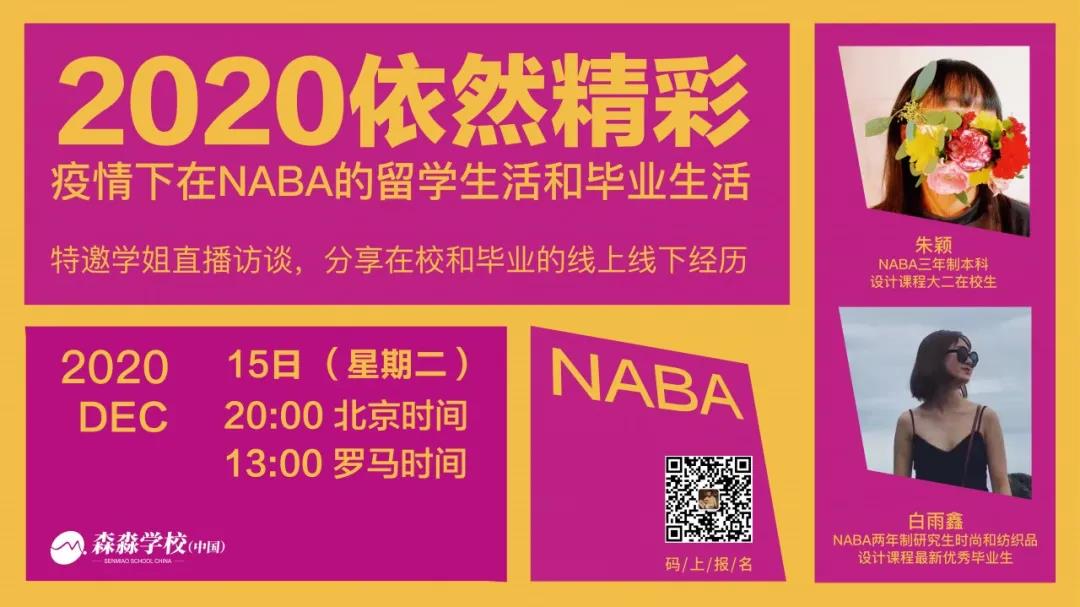 12月15日(周二) 北京时间20:00/意大利时间13:00,NABA本科设计课程的朱颖童鞋与研究生时尚和纺织品设计课程白雨鑫童鞋,将为大家做直播专访线上面对面分享疫情下NABA精彩的留学生活和毕业生活,从线上课程、小组作业、到毕业设计,呈现给大家一个真实的留学生活。