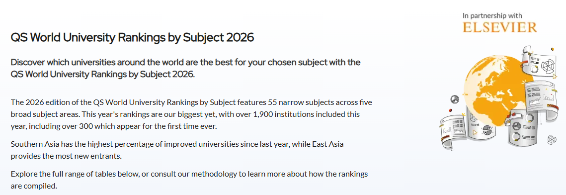 全球高等教育分析机构QS Quacquarelli Symonds(QS)正式发布了 2026 QS世界大学学科排名。本次排名独立分析了全球 100 多个国家、1900 余所高校的超 21000 个学术项目,涵盖 55 个学科及五大领域:艺术与人文、工程与技术、生命科学与医学、自然科学、社会科学与经管学科。