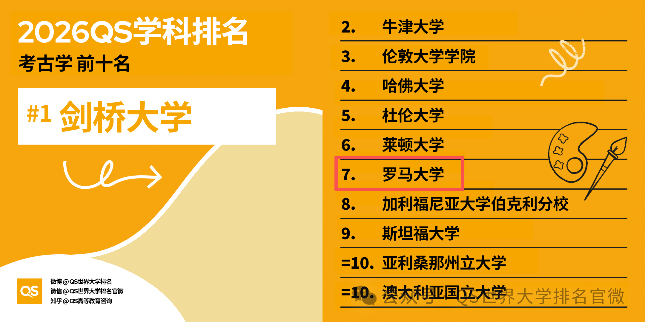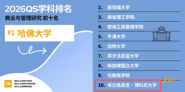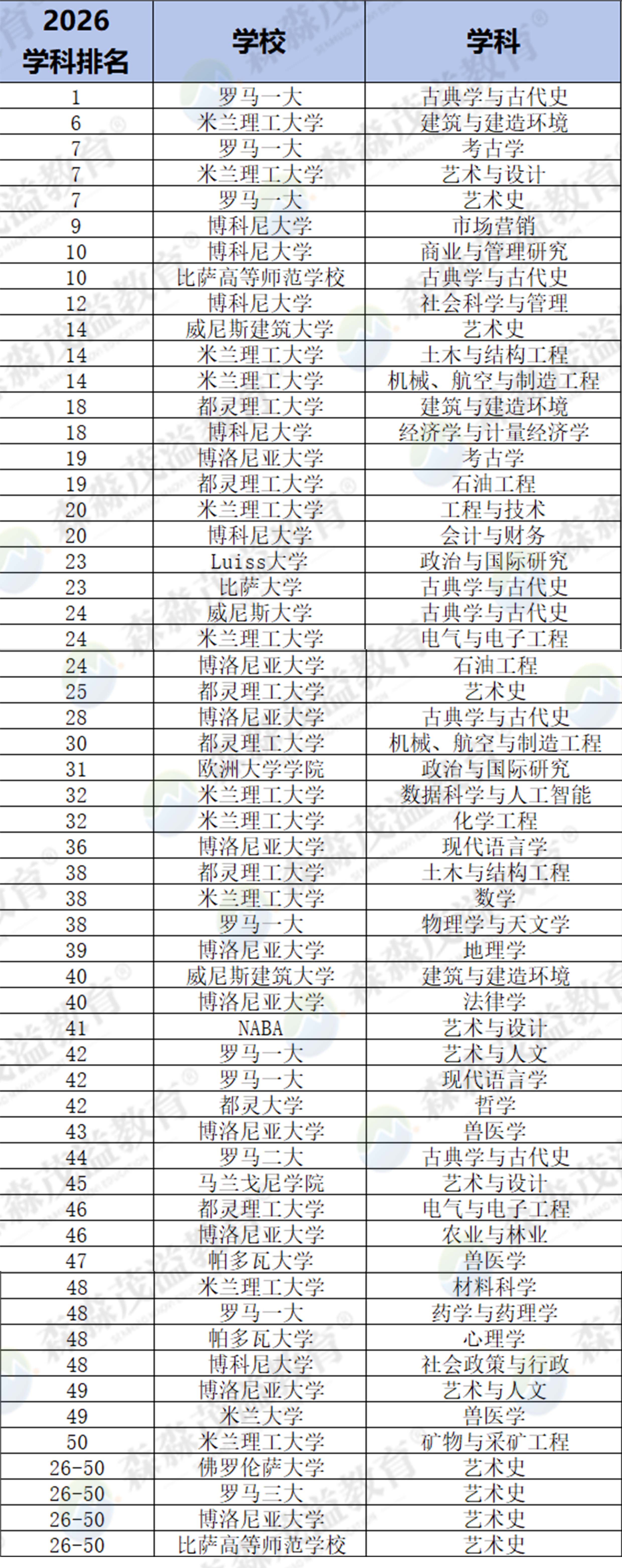 意大利共有 4 所大学的 7 个专业进入全球排名前十,分别是罗马一大、米兰理工大学、博科尼大学、比萨高等师范学校。