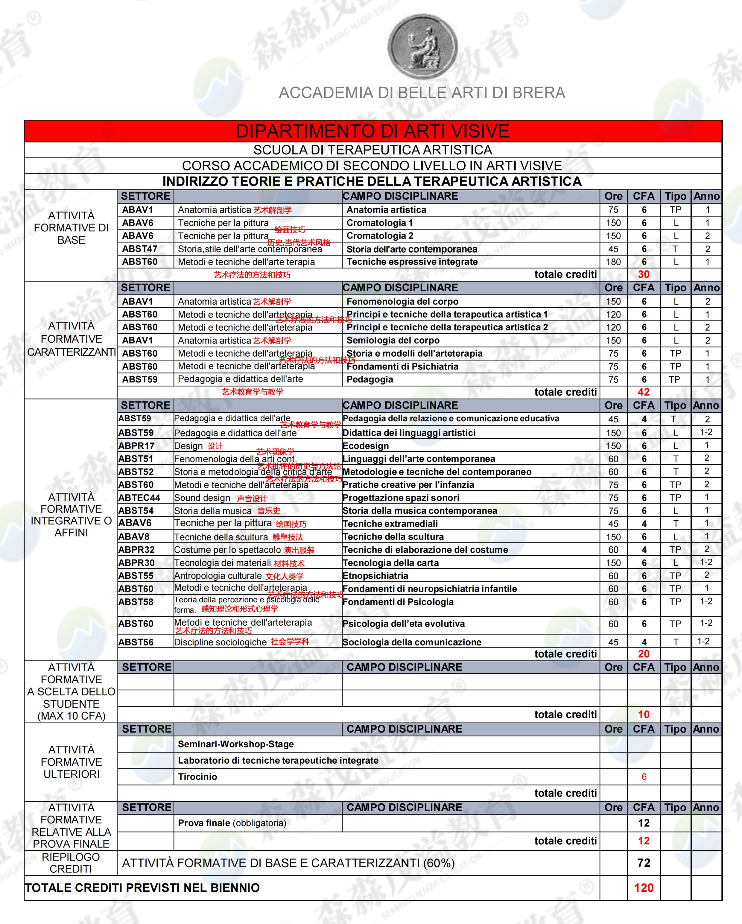 米兰布雷拉美院硕士艺术疗愈专业课程列表 ↓