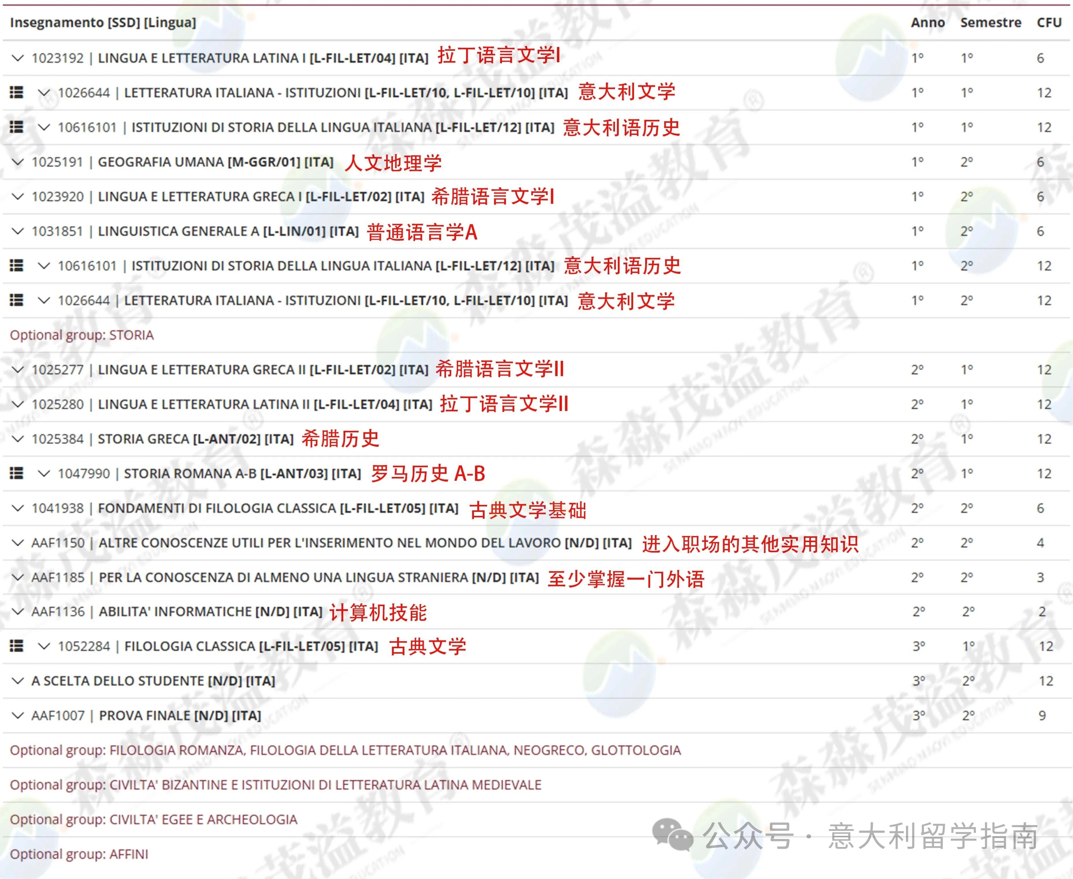 以罗马一大的意授-本科-古典学为例,学习的课程有:
